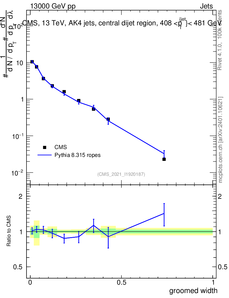 Lines: data, pythia8 8.315 ropes |