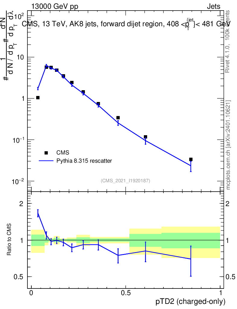 Lines: data, pythia8 8.315 rescatter |