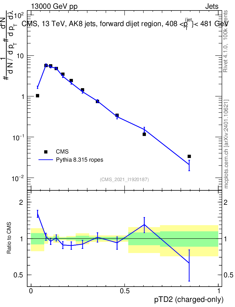 Lines: data, pythia8 8.315 ropes |