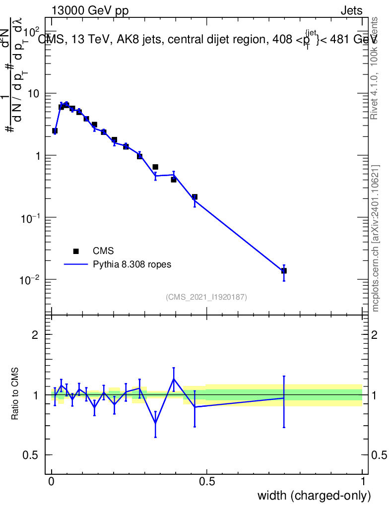 Lines: data, pythia8 8.308 ropes |