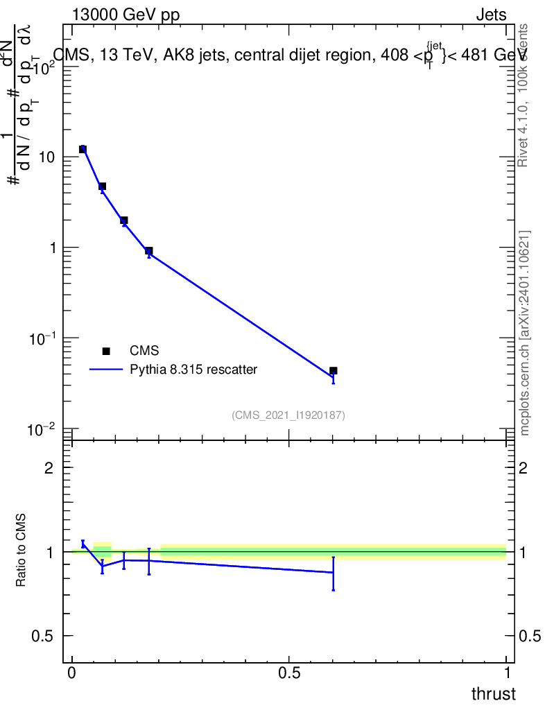 Lines: data, pythia8 8.315 rescatter |
