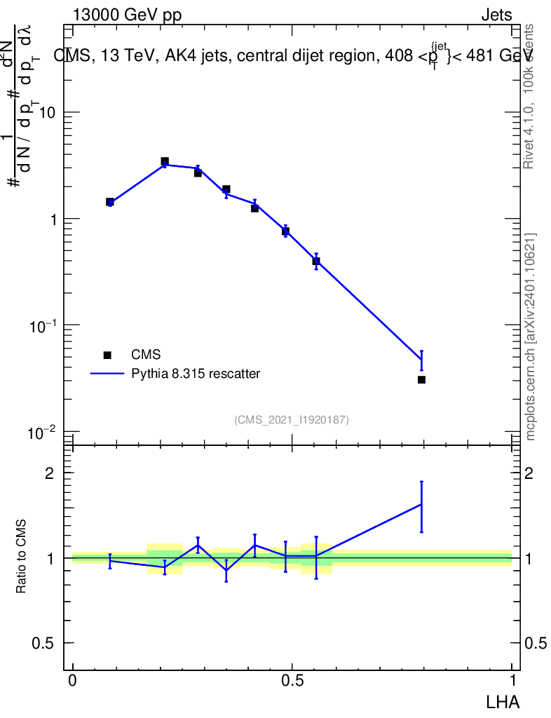 Lines: data, pythia8 8.315 rescatter |