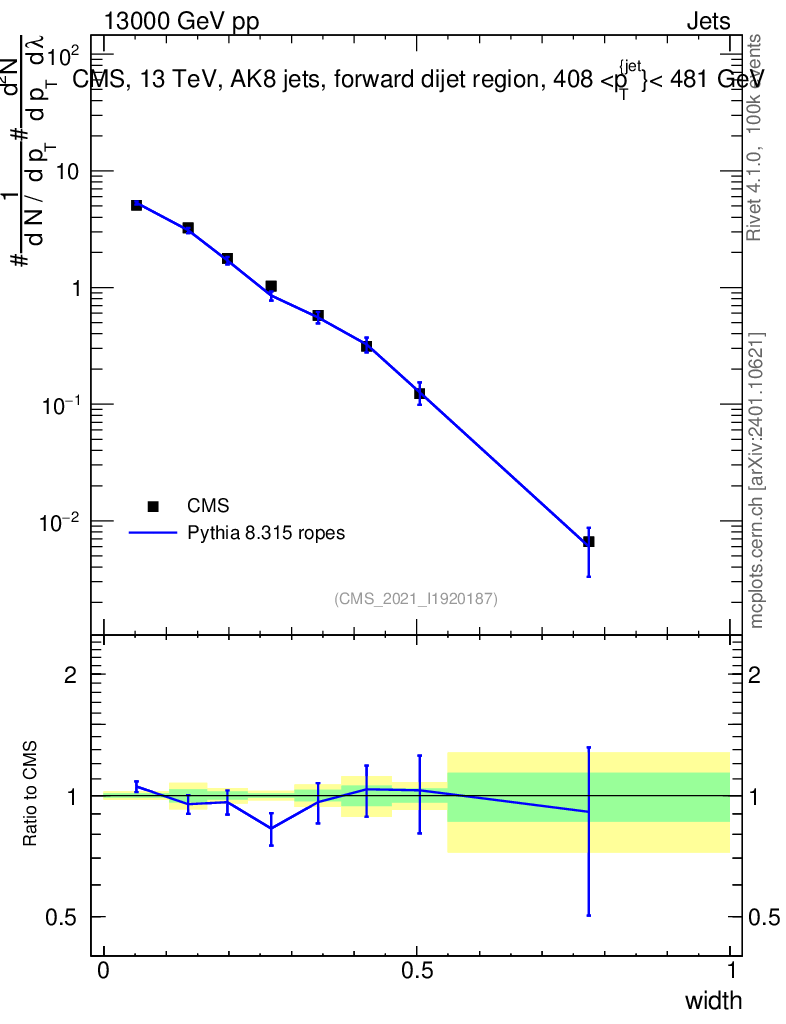 Lines: data, pythia8 8.315 ropes |