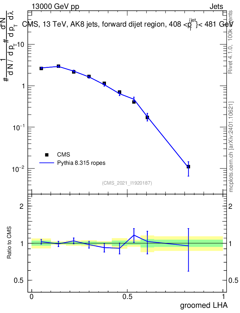 Lines: data, pythia8 8.315 ropes |