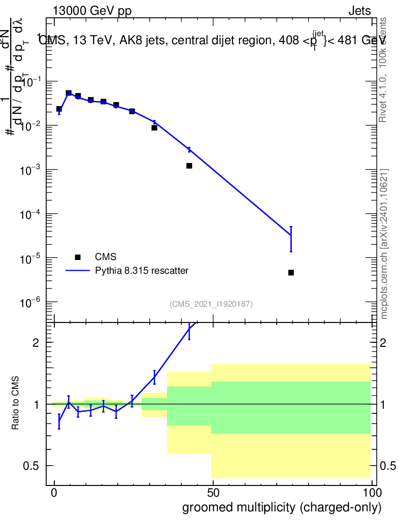 Lines: data, pythia8 8.315 rescatter |