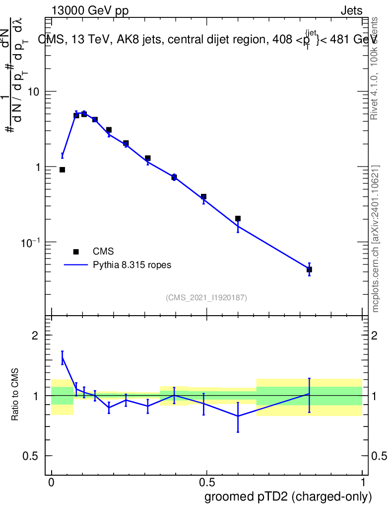 Lines: data, pythia8 8.315 ropes |