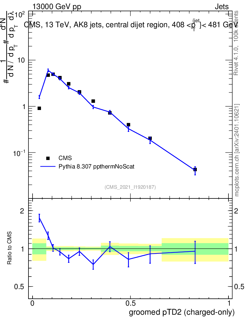Lines: data, pythia8 8.307 ppthermNoScat |