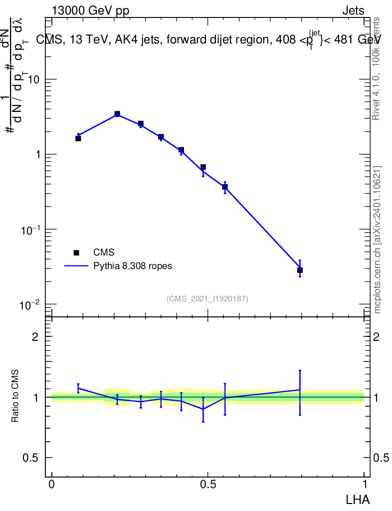 Lines: data, pythia8 8.308 ropes |