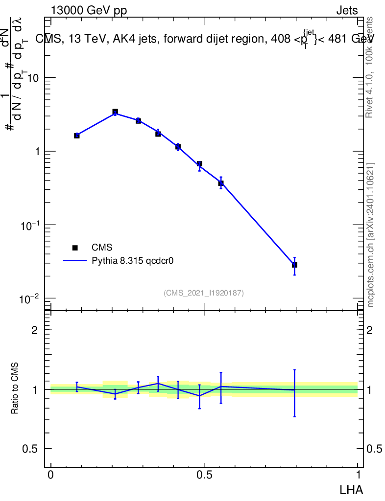 Lines: data, pythia8 8.315 qcdcr0 |
