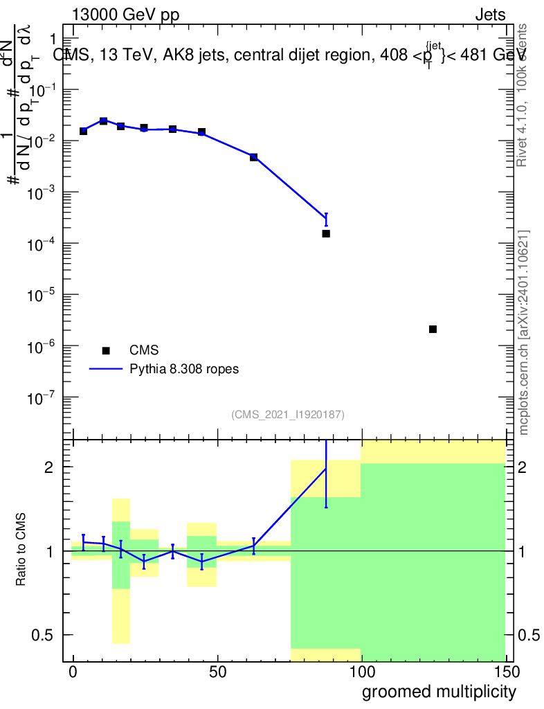 Lines: data, pythia8 8.308 ropes |