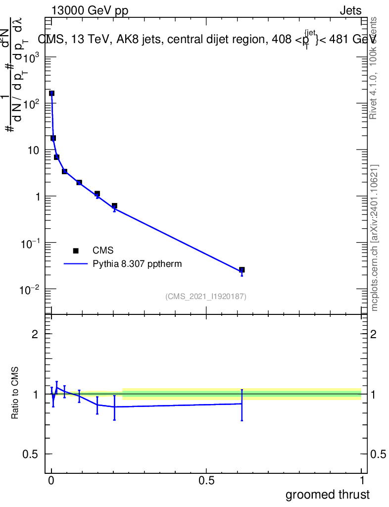 Lines: data, pythia8 8.307 pptherm |