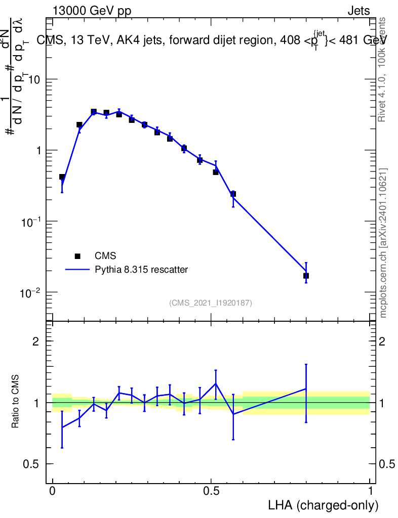 Lines: data, pythia8 8.315 rescatter |