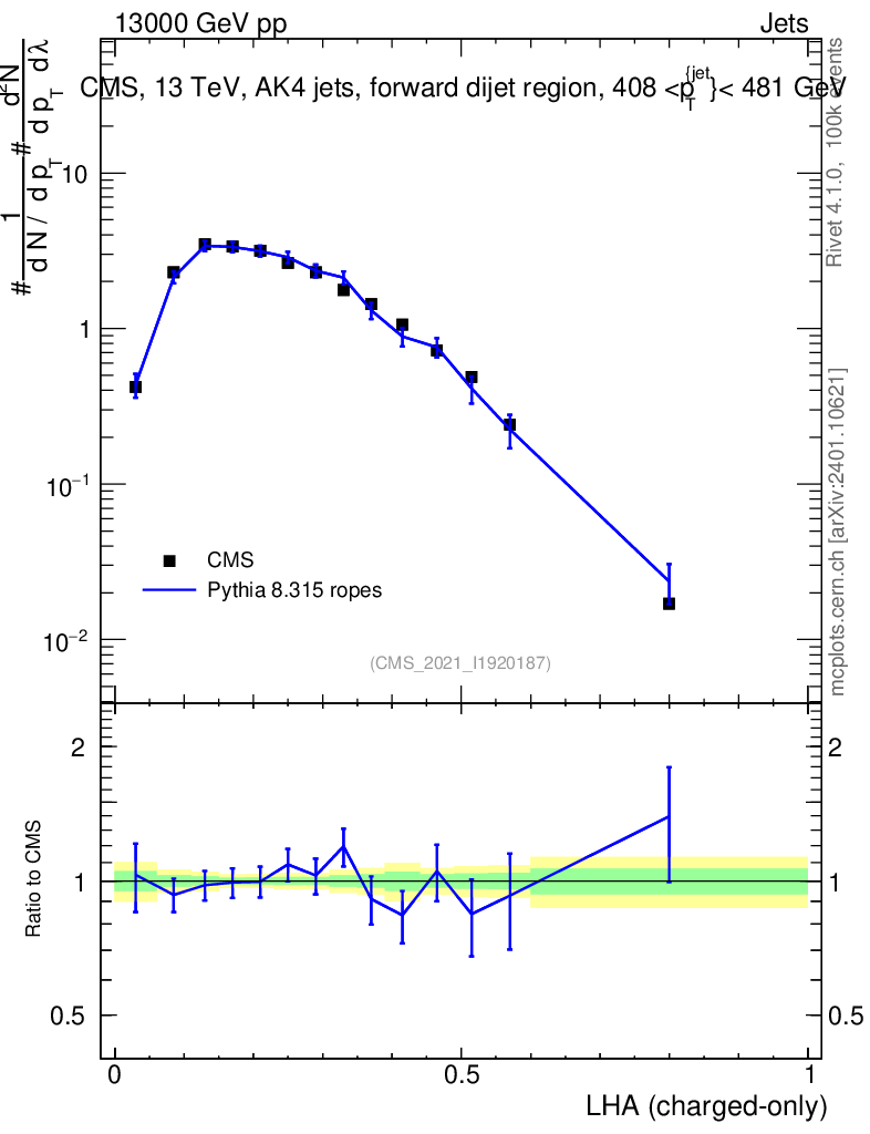 Lines: data, pythia8 8.315 ropes |