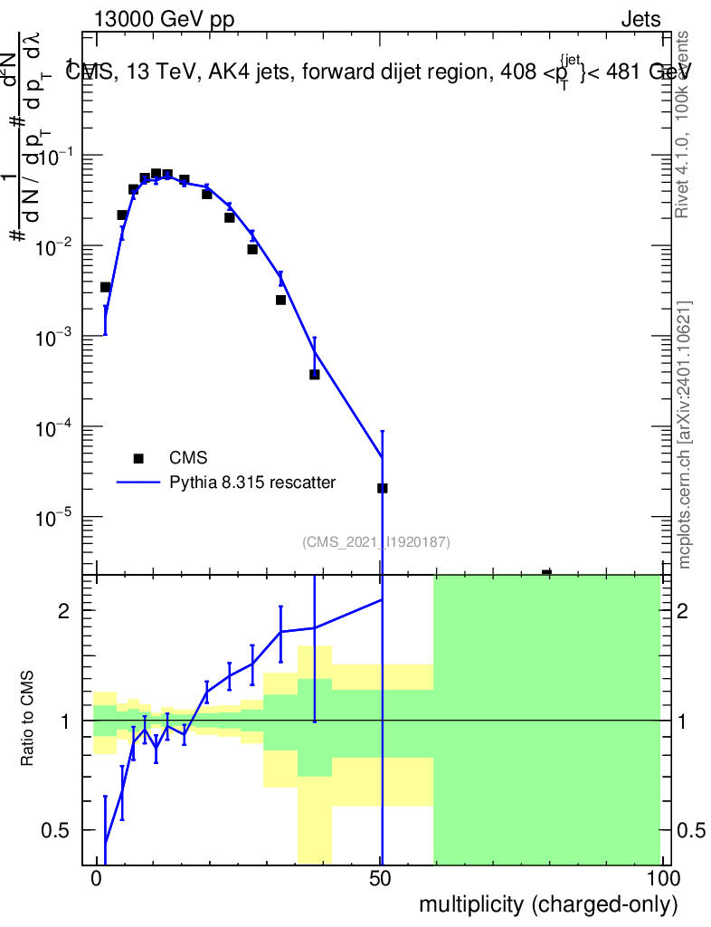 Lines: data, pythia8 8.315 rescatter |