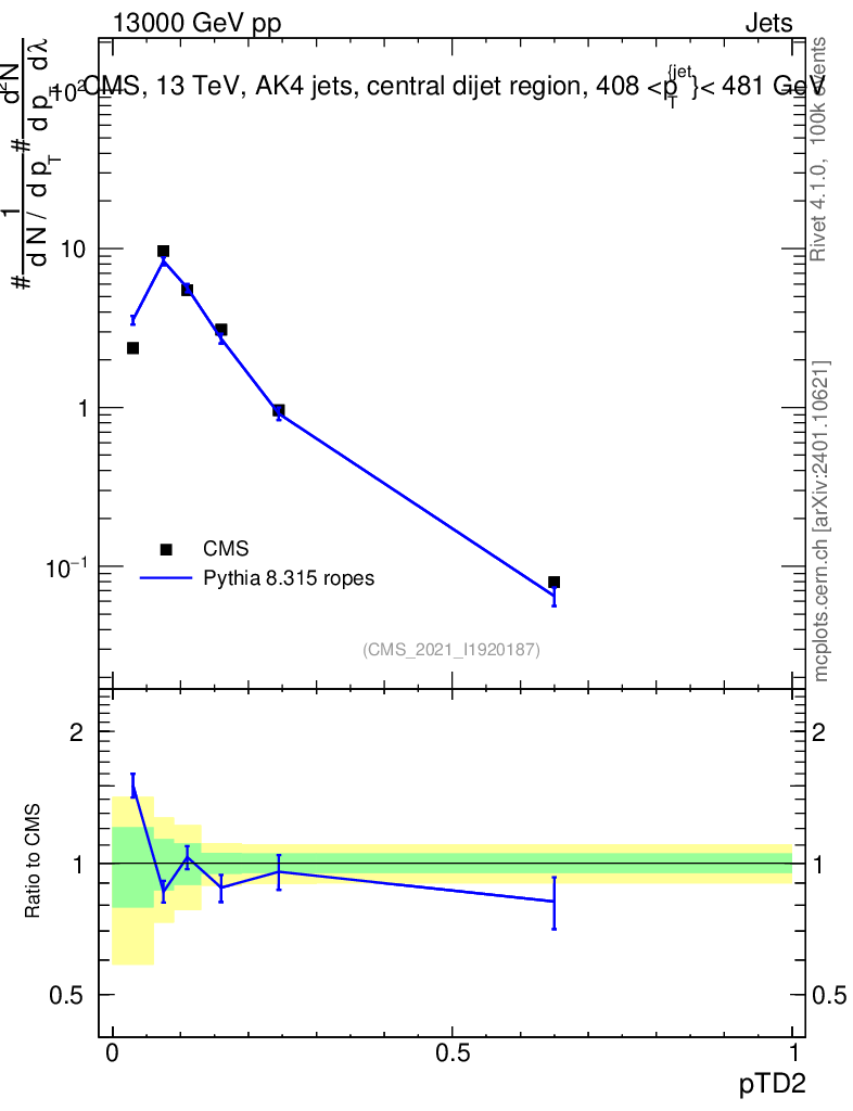 Lines: data, pythia8 8.315 ropes |