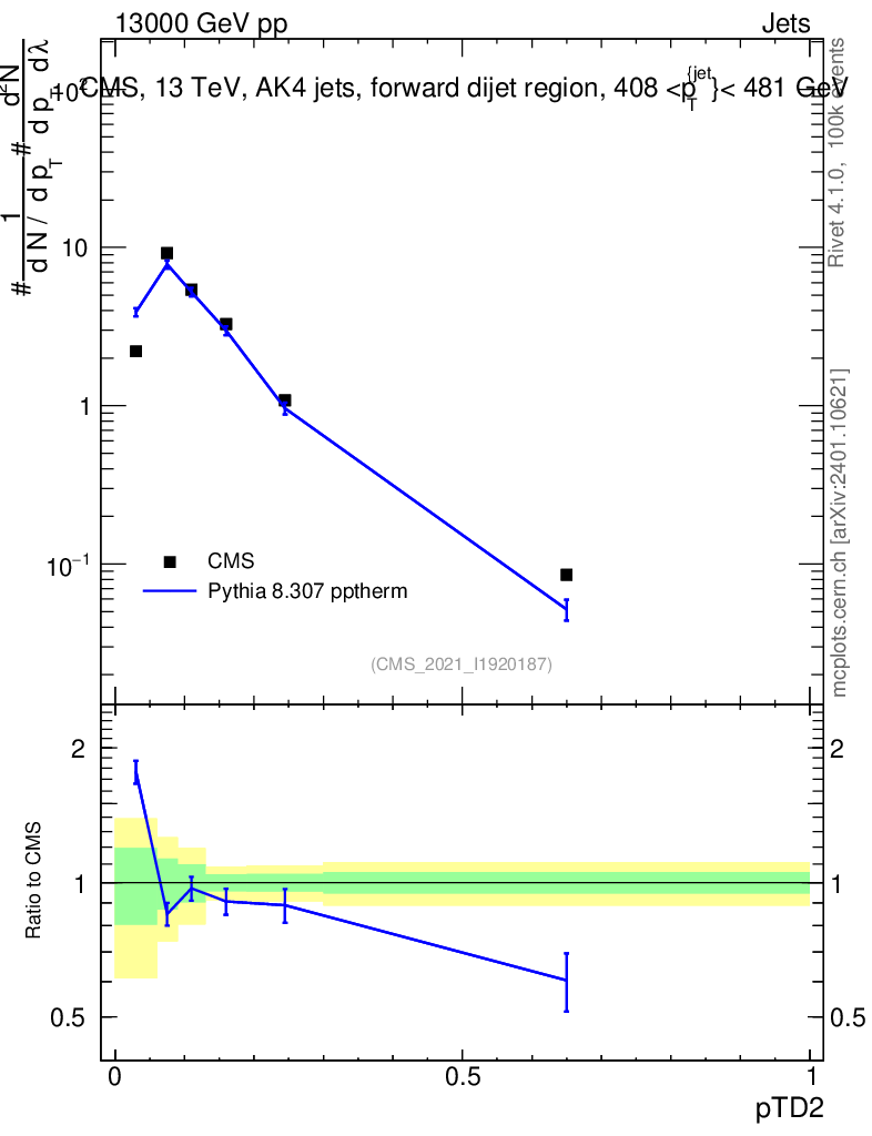 Lines: data, pythia8 8.307 pptherm |