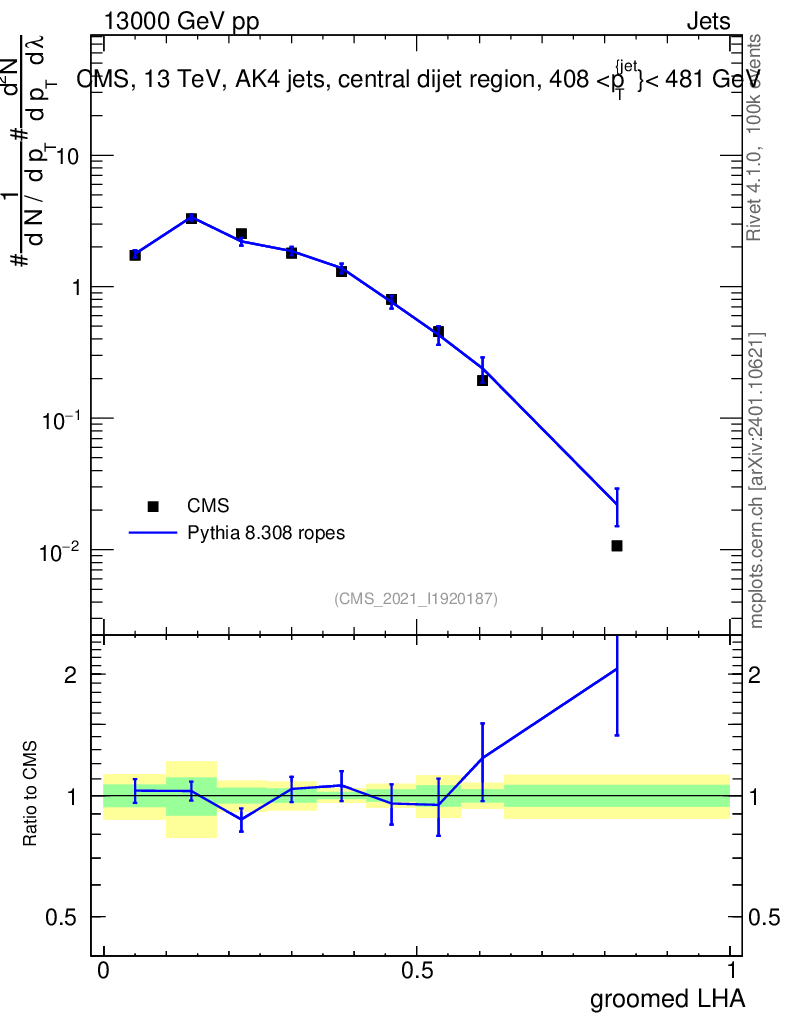 Lines: data, pythia8 8.308 ropes |