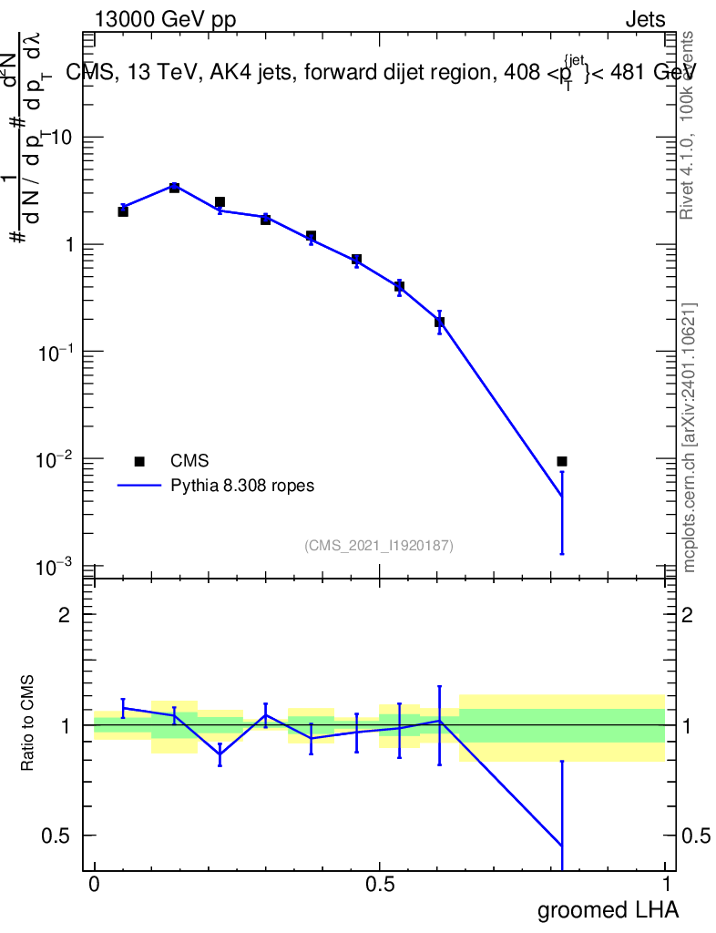 Lines: data, pythia8 8.308 ropes |