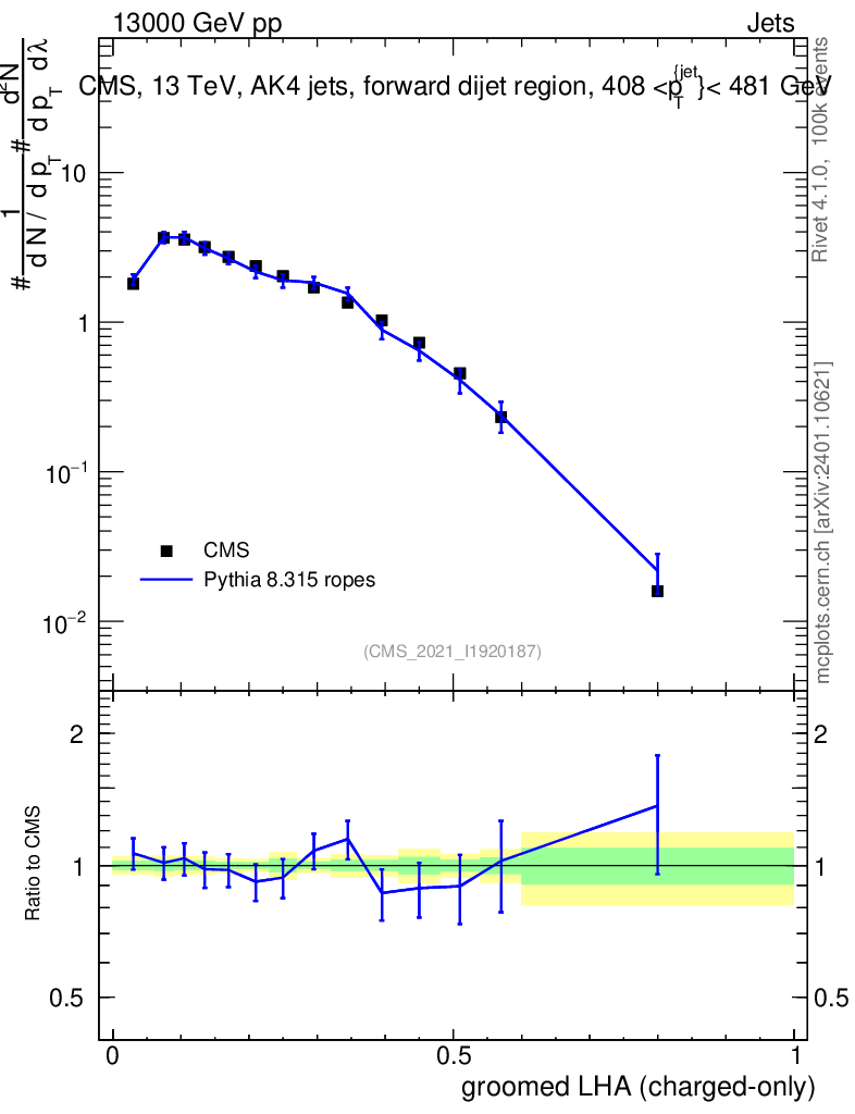 Lines: data, pythia8 8.315 ropes |