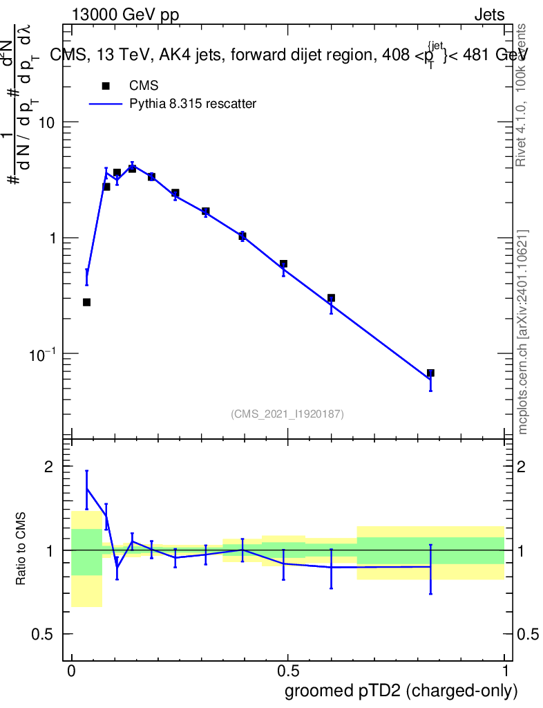 Lines: data, pythia8 8.315 rescatter |
