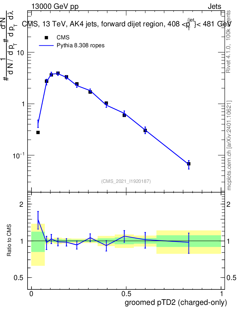 Lines: data, pythia8 8.308 ropes |