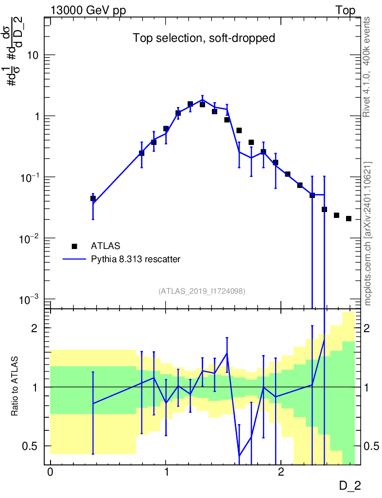 Lines: data, pythia8 8.313 rescatter | compare with other tunes
