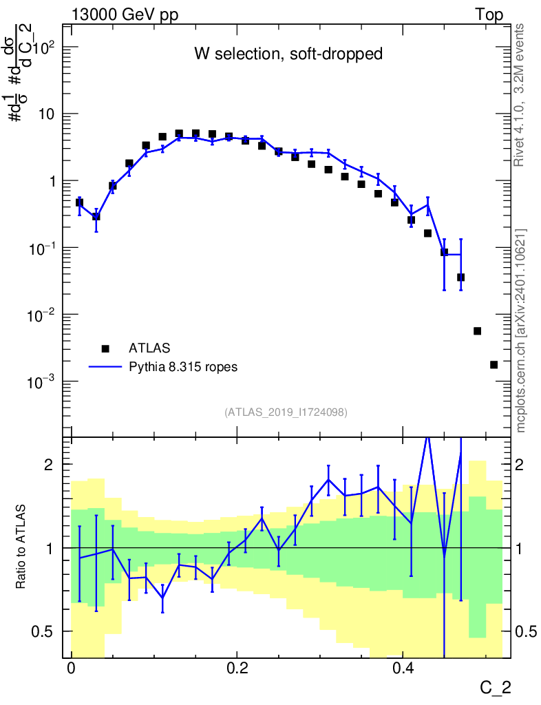 Lines: data, pythia8 8.315 ropes |