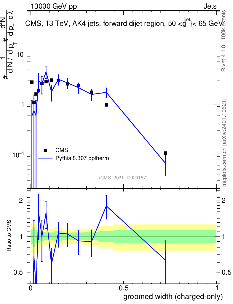 Lines: data, pythia8 8.307 pptherm |