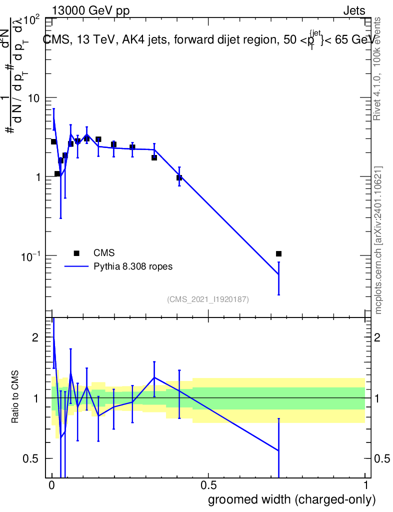 Lines: data, pythia8 8.308 ropes |