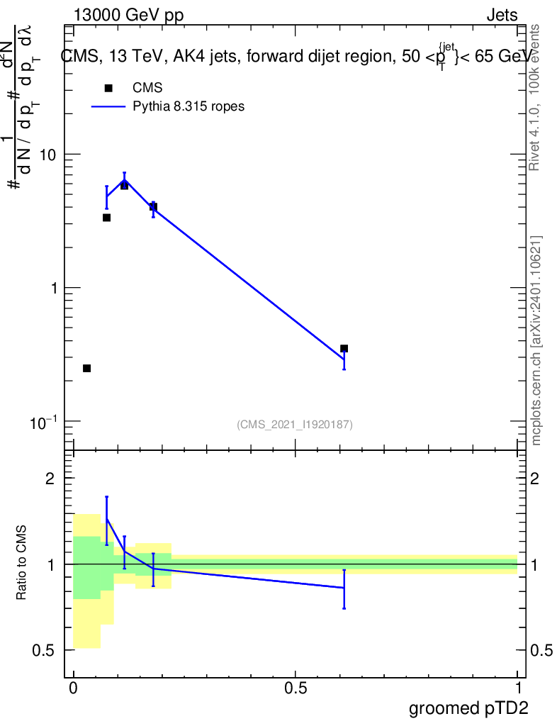 Lines: data, pythia8 8.315 ropes |