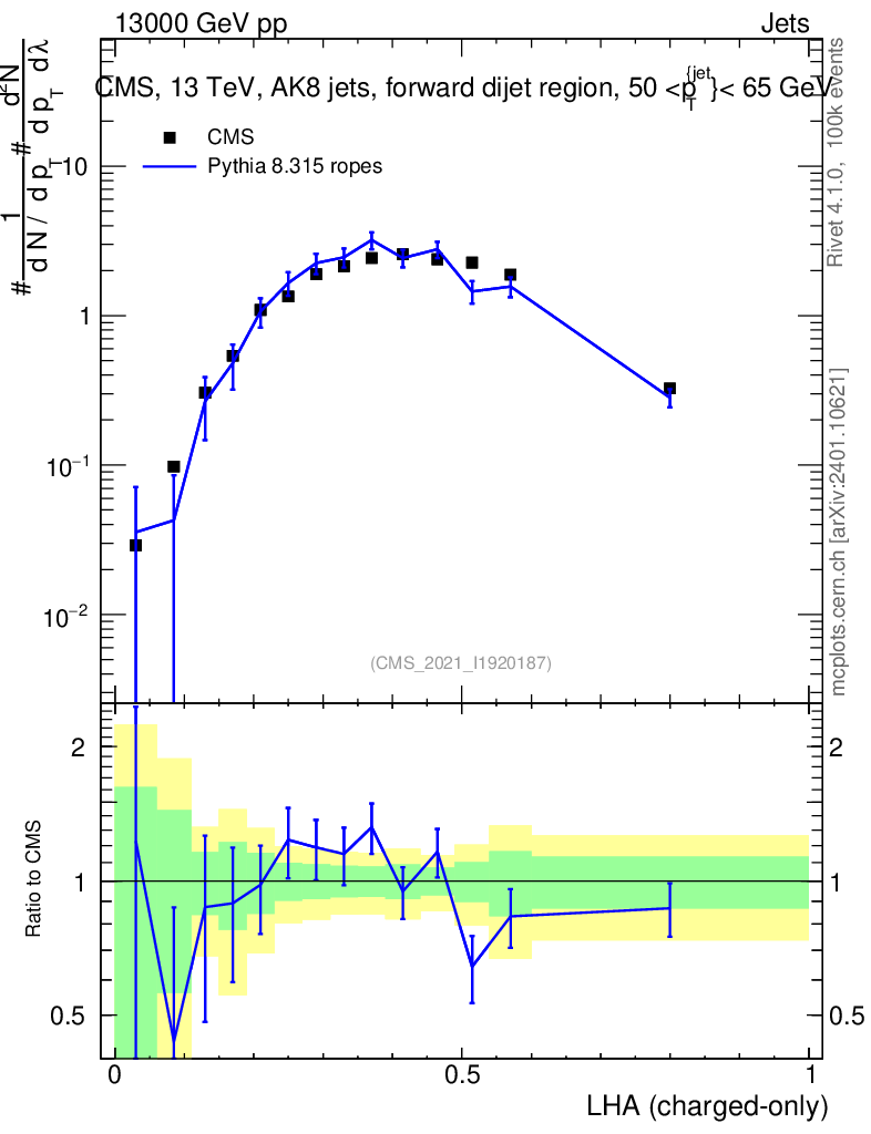Lines: data, pythia8 8.315 ropes |