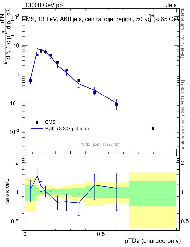 Lines: data, pythia8 8.307 pptherm |