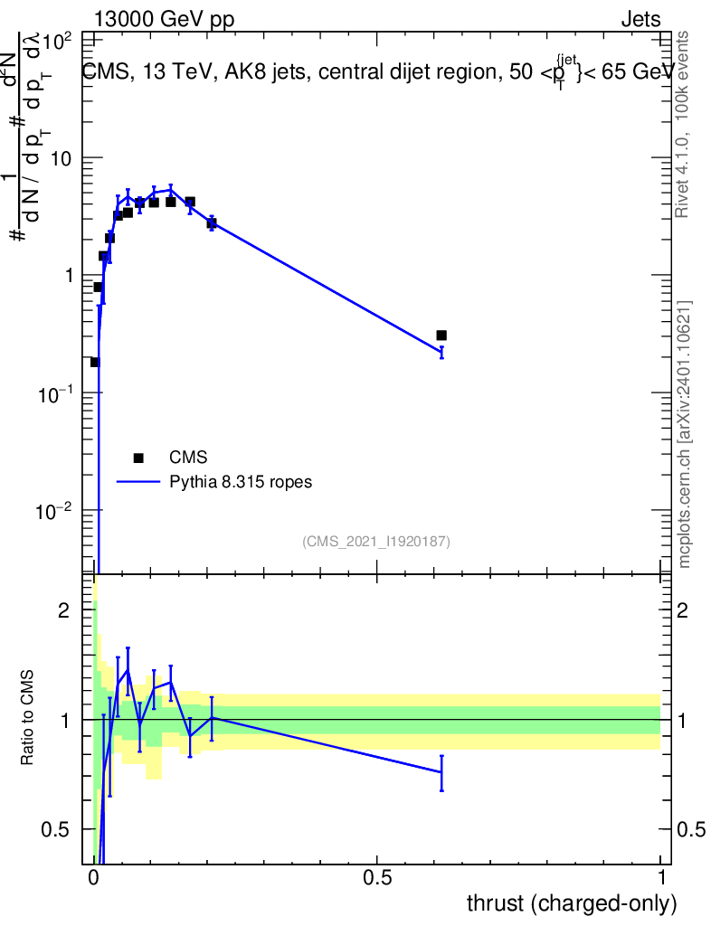 Lines: data, pythia8 8.315 ropes |