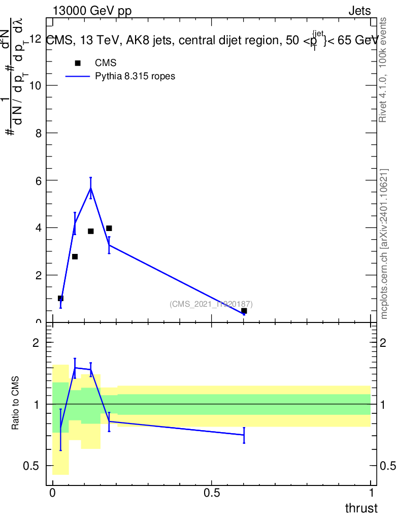 Lines: data, pythia8 8.315 ropes |