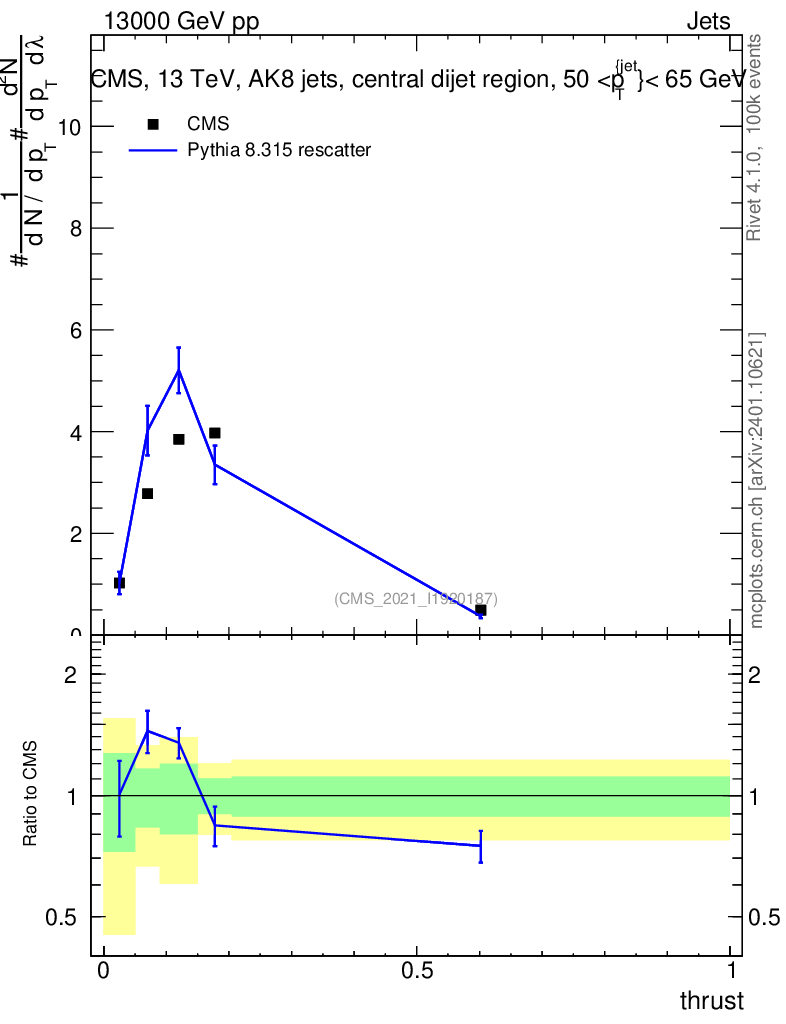 Lines: data, pythia8 8.315 rescatter |