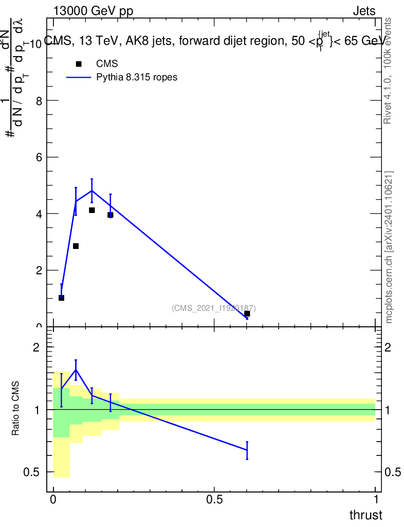 Lines: data, pythia8 8.315 ropes |