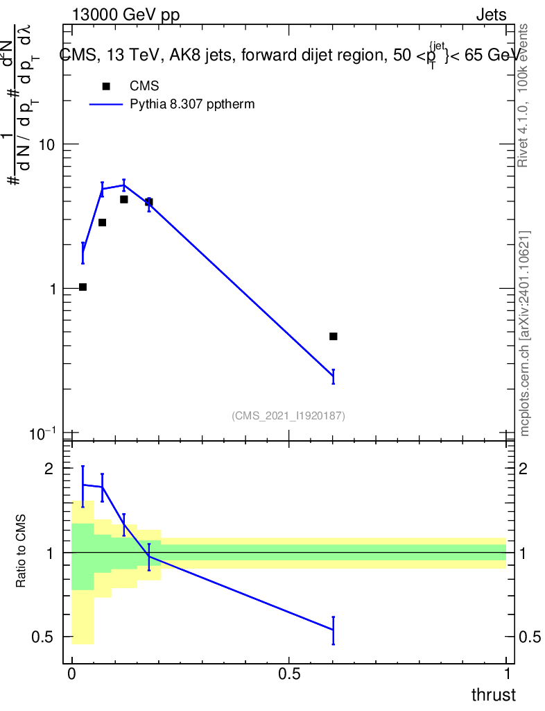 Lines: data, pythia8 8.307 pptherm |