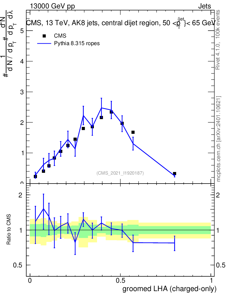 Lines: data, pythia8 8.315 ropes |