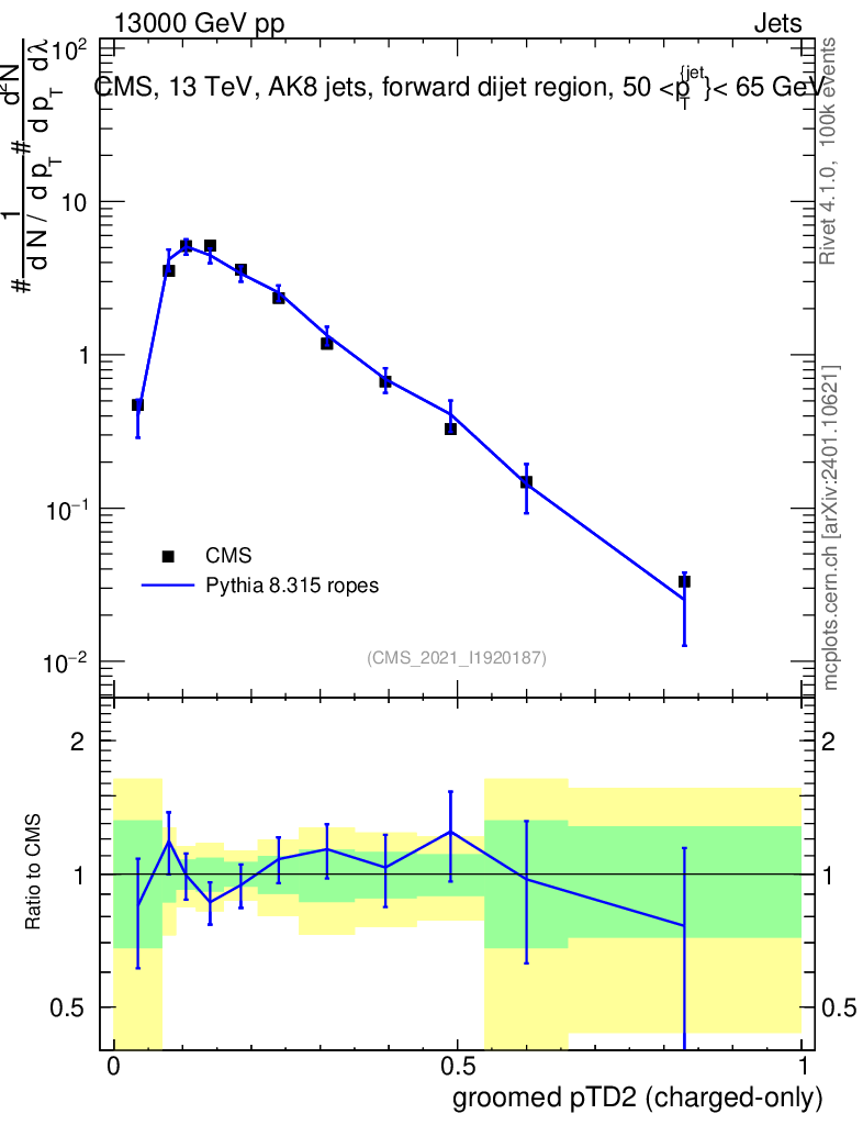 Lines: data, pythia8 8.315 ropes |