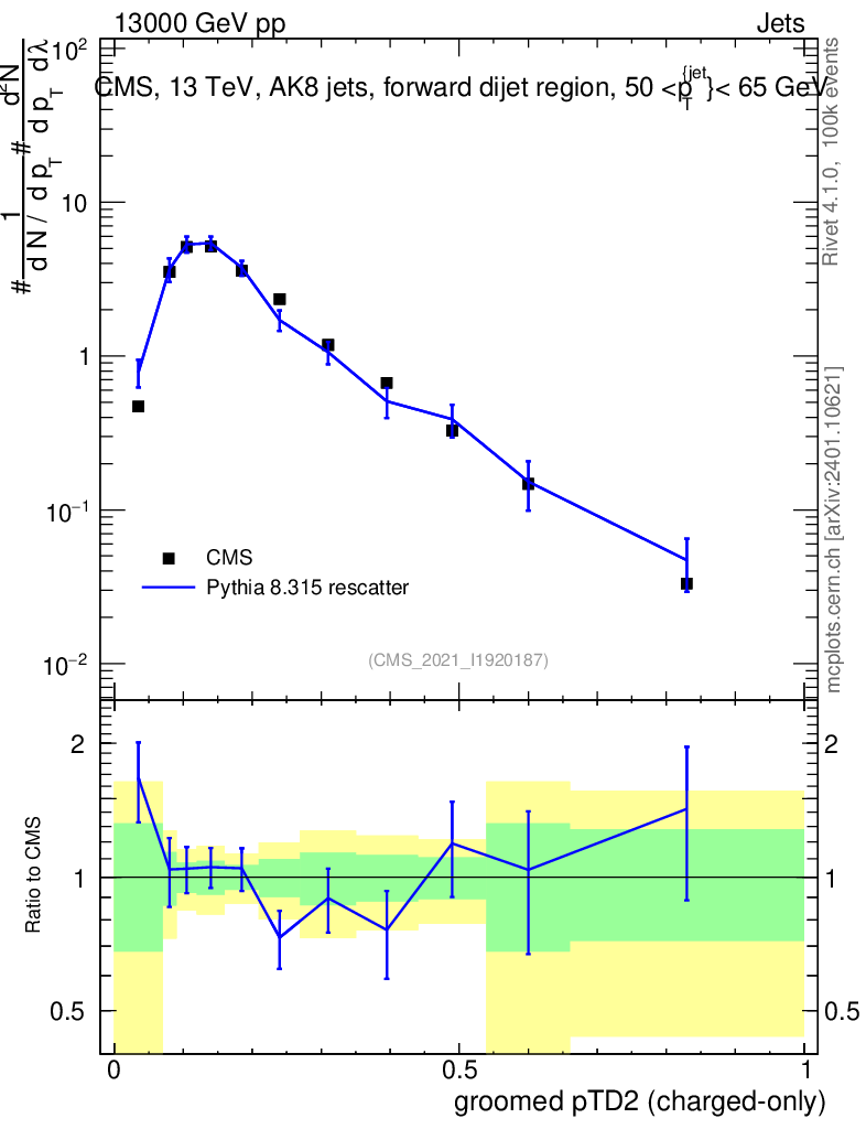 Lines: data, pythia8 8.315 rescatter |