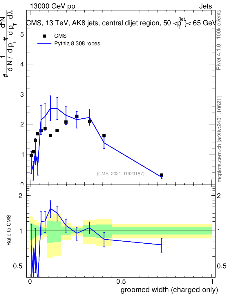 Lines: data, pythia8 8.308 ropes |