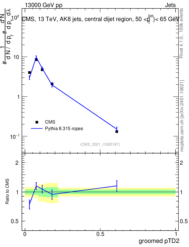 Lines: data, pythia8 8.315 ropes |