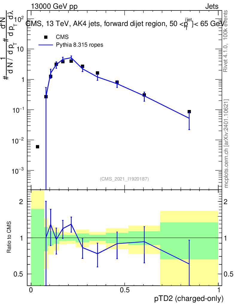 Lines: data, pythia8 8.315 ropes |