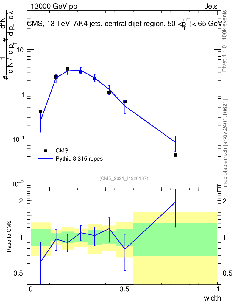 Lines: data, pythia8 8.315 ropes |