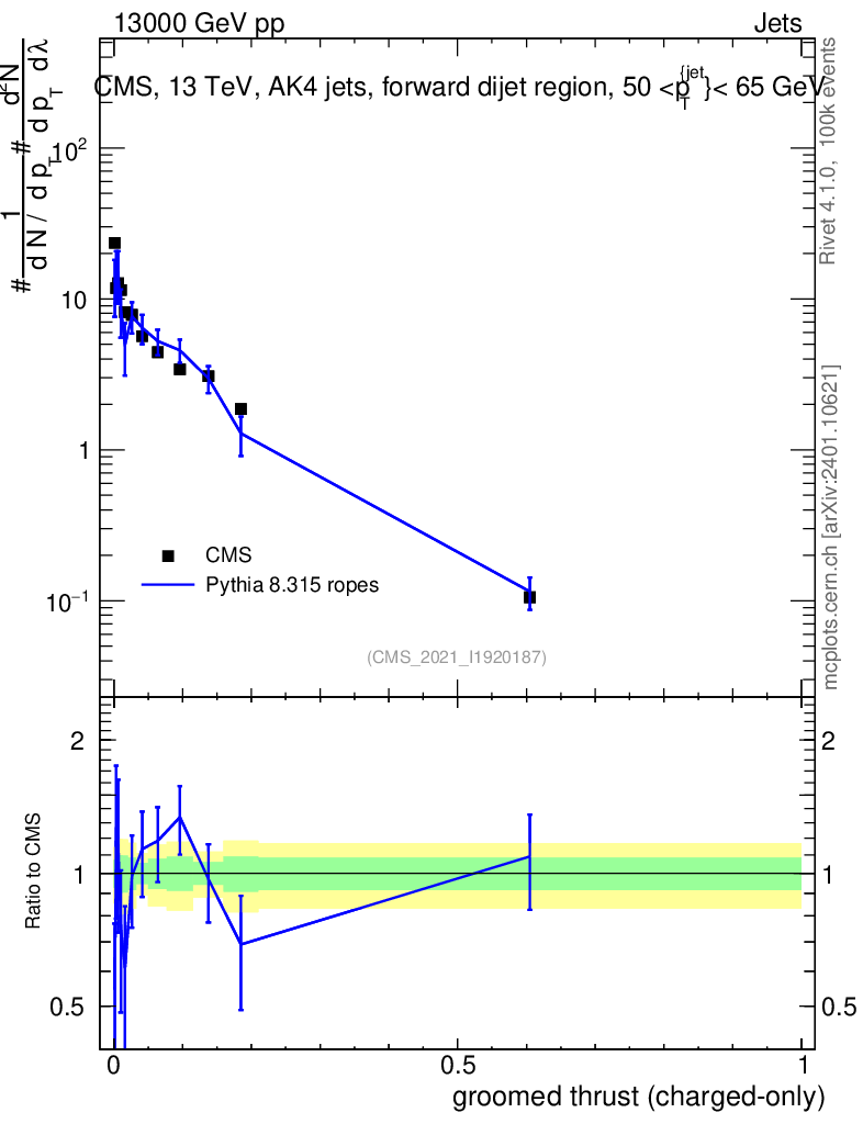 Lines: data, pythia8 8.315 ropes |