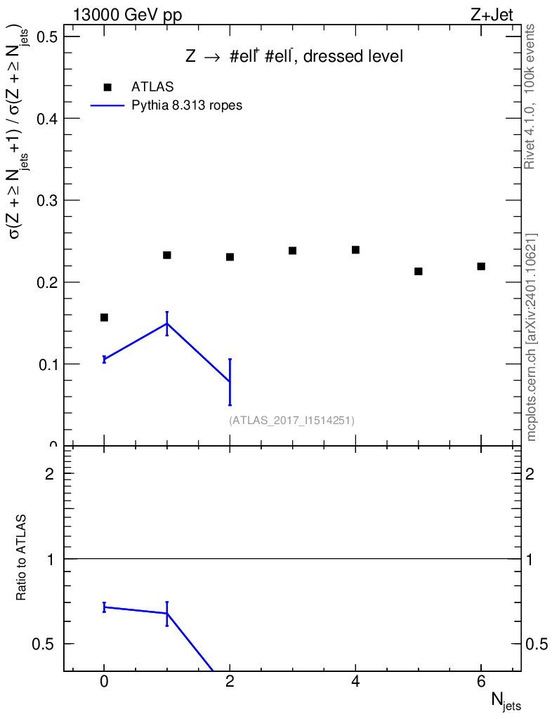 Lines: data, pythia8 8.313 ropes |