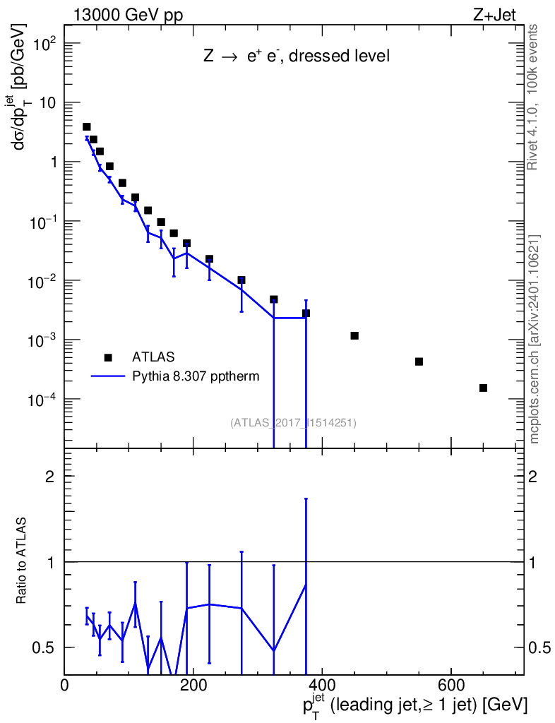 Lines: data, pythia8 8.307 pptherm |