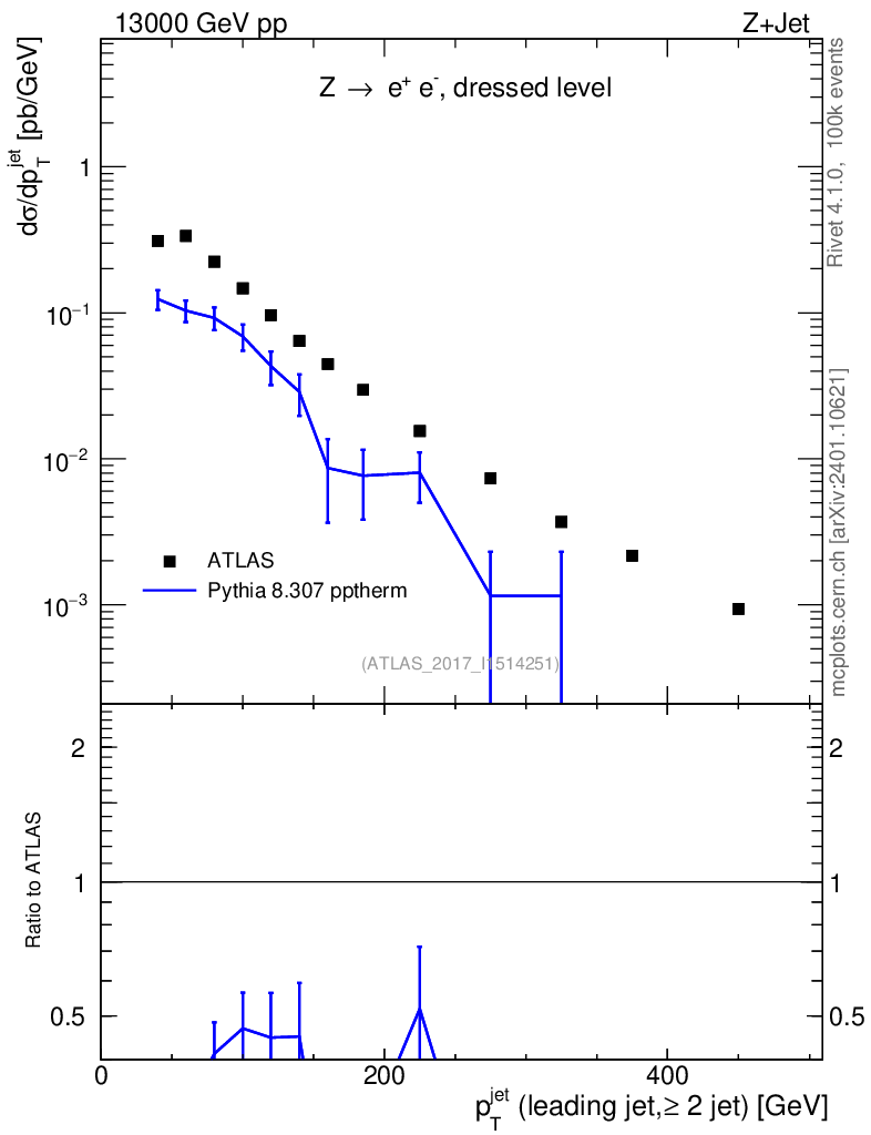 Lines: data, pythia8 8.307 pptherm |