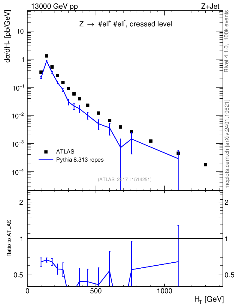 Lines: data, pythia8 8.313 ropes |