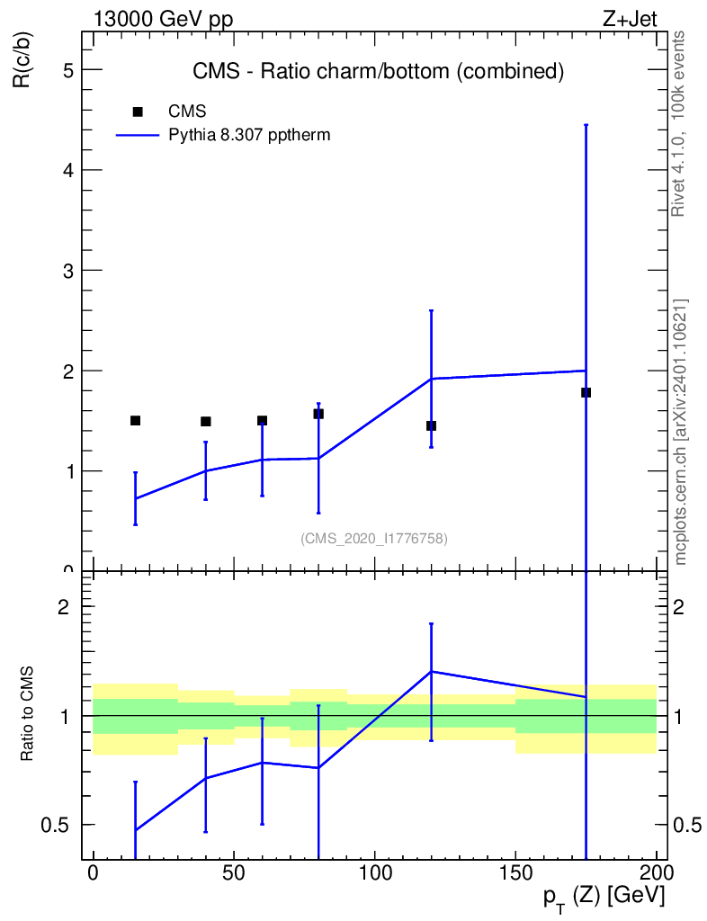 Lines: data, pythia8 8.307 pptherm |